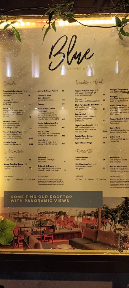 Welcome to Blue Bistrot, a hidden gem nestled in the heart of Lisbon at R. Barata Salgueiro 55. This stylish and classy restaurant boasts a menu that effortlessly marries affordability with quality. For just €18, guests can indulge in a daily menu that includes a main dish, dessert, and a water jug—perfect for a delightful dining experience.